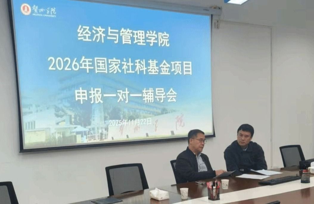 为破解2026年国家社科基金项目申报中的重点难点问题,切实提升教师选题质量与申报书撰写水平,助力学院科研工作提质增效,11月22日下午,贺州学院经济与管理学院在学院205会议室举办了2026年国家社科基金项目申报一对一辅导会。会议特邀广西师范大学教授、博士生导师黎鹏教授莅临指导,经济与管理学院全体拟申报2026年国家社科基金项目的教师参会。