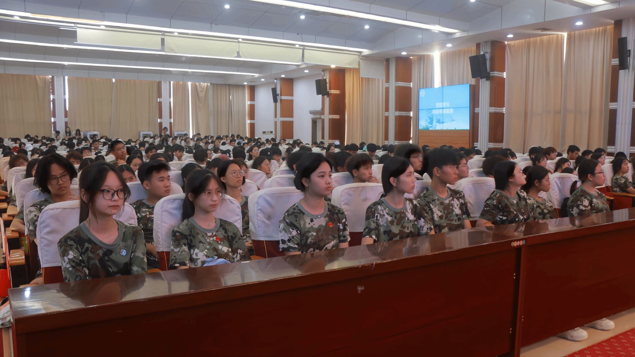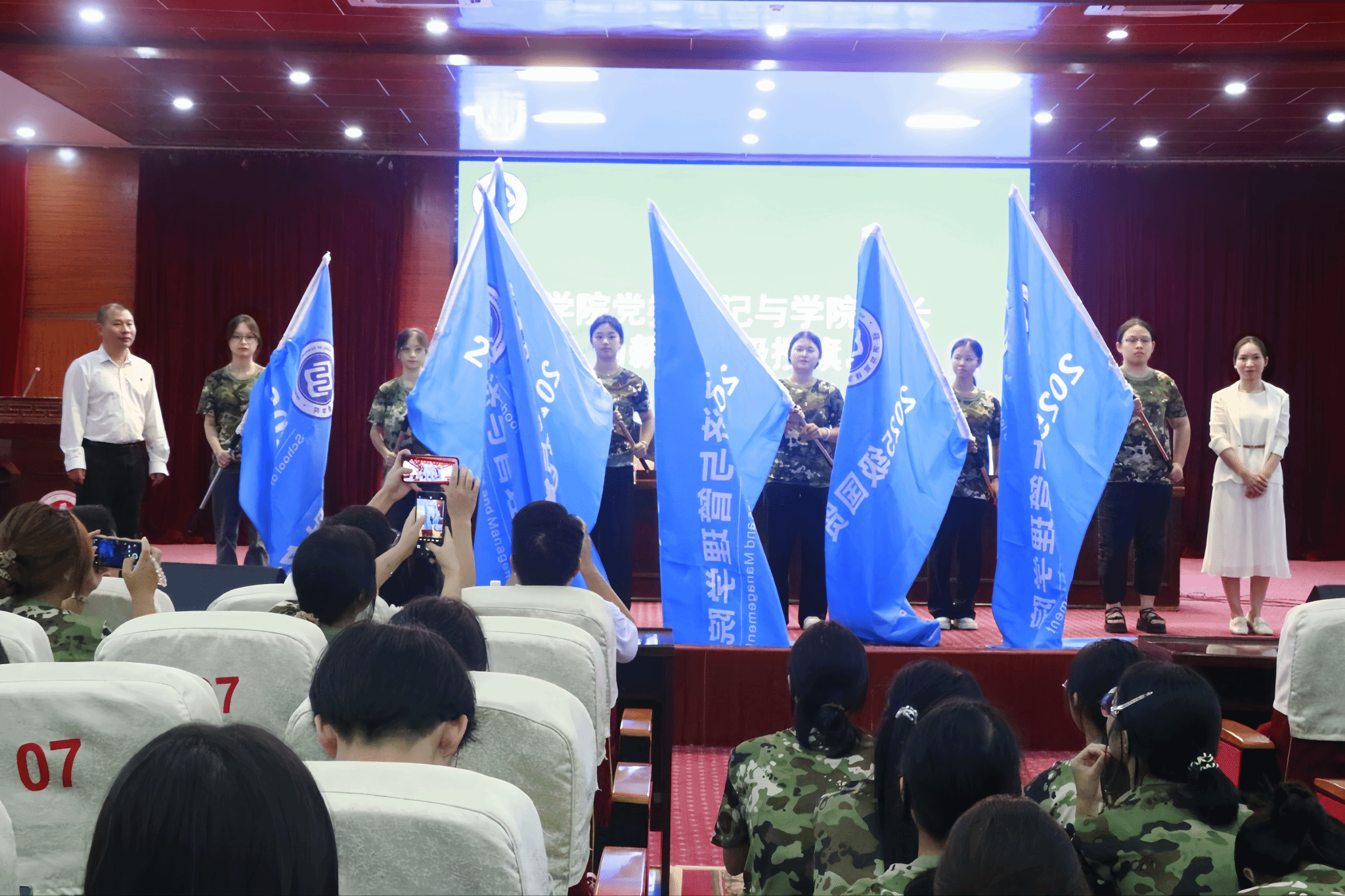 学院党委书记黄雪强与院长向丽为新生班级授旗,鲜艳的旗帜传递着责任与希望,伴随着激昂的旋律,全体人员奏唱校歌,歌声中满是对学校的热爱与对未来的期许。
