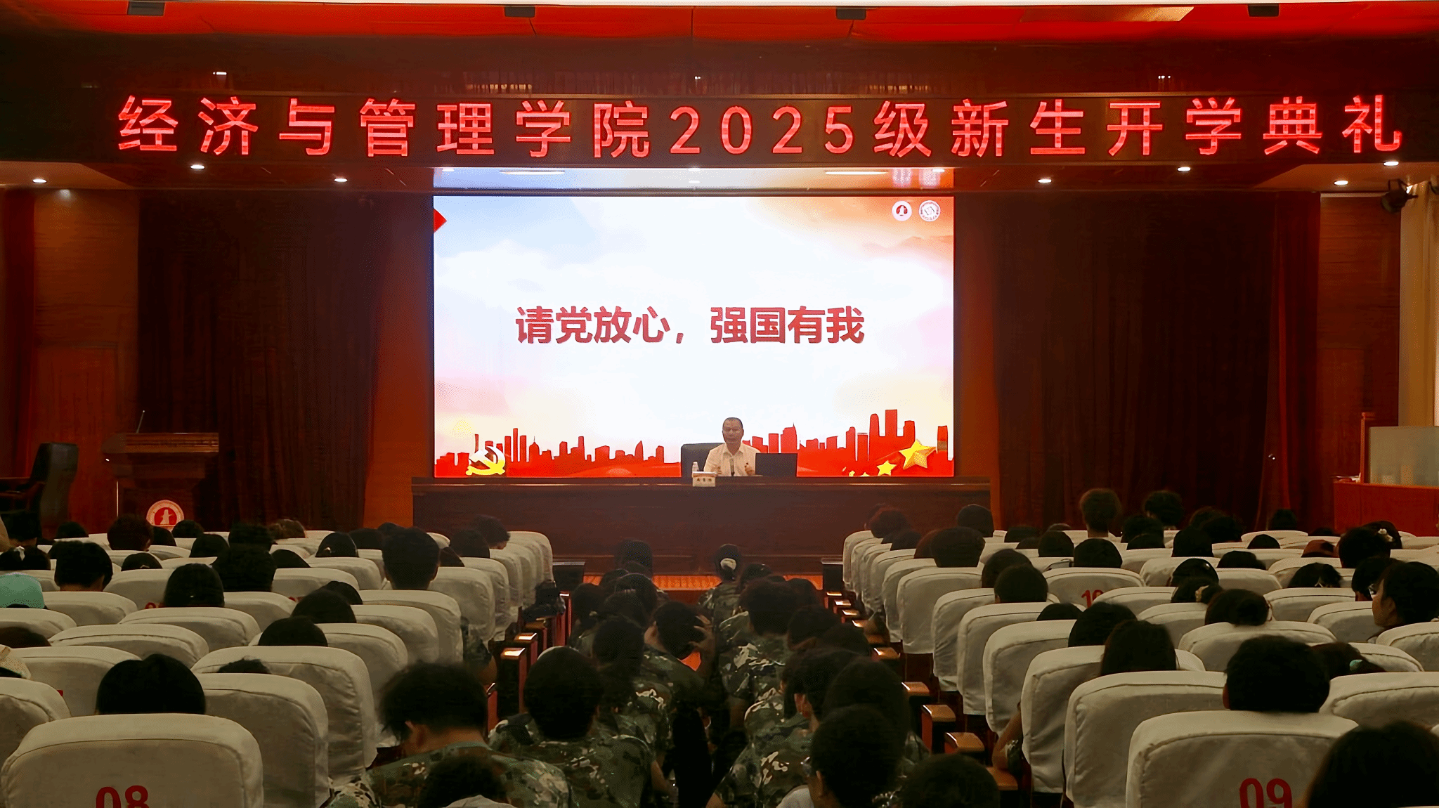 教师代表、经济与管理学院况玉书博士以“点亮思想,奔赴山海”为题,寄语新生要培养独立思考能力,并提出了以“树立一个目标、投入一门心思、保持一往无前、实现一定成功”为核心的“四个一”成长建议;在校生代表、2023级国际经济与贸易专业李肖怡分享了自己从“归零”到“重建”的成长体会,鼓励新生保持好奇、专注实践、勇于合作;本科新生代表、经济与管理学院2025级金融科技专业覃彬桓表达了对大学生活的热切期待,并表示将珍惜时光、勤奋学习,努力成长为有理想、有担当的新时代青年。
